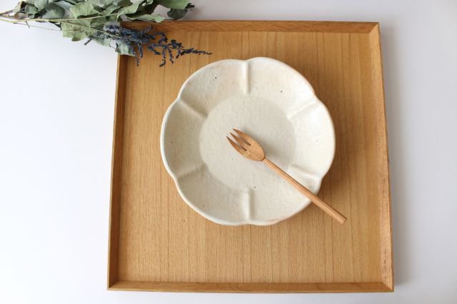 This is a white flower plate with a soft texture. This round flower plate has a cute flower shape and has many female fans. The gentle, rustic reddish earthy flavor and the flow and pooling of the glaze create a deep atmosphere. It will brighten up your dining table, making even the most ordinary menu items look much brighter and more fun.