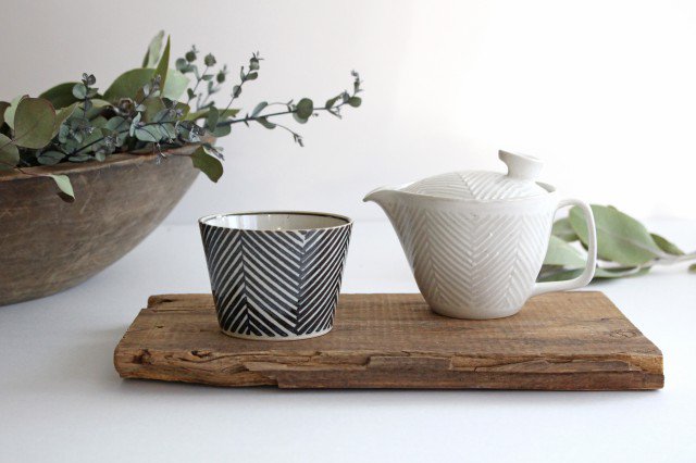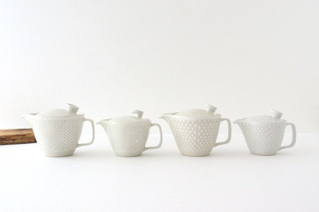A teapot with an impressive herringbone pattern. It has a modern look typical of Hasami ware, and is a Japanese or Western design that goes well with tea and black tea. The herringbone pattern of this ORIME series is made of ceramic, which is unusual for Hasami ware, which is often made of porcelain, so you can feel the soft atmosphere of pottery. It has a unique design with the lid handle slightly set back. Actually, it can be hung on the mouth of the pot. It's functionally beautiful. It also has a large mouth, making it easy to clean. Comes with a stainless steel tea strainer. It's great for brewing black tea, green tea, or even coffee and serving it at the table. The white color is characterized by an uneven texture that looks like it has been embossed.