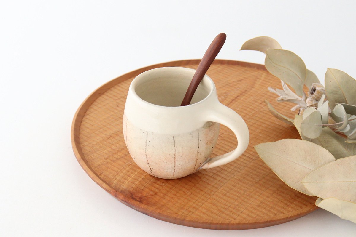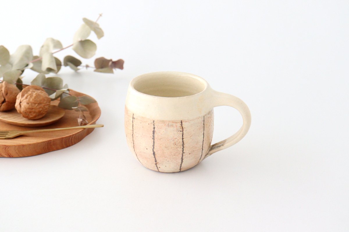 This mug has a cute egg-like shape. The loose vertical lines create a warm feeling. Each grilled color has a unique appearance, with a slight pink or beige tinge. The slightly glossy texture and warm texture unique to Kohiki will create a warm and comforting dining table.