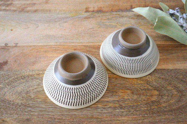 This rice bowl has an impressive dotted pattern of "Tobikanna" that shows the skill of handcrafted work. Although it has been around for a long time, it has a somewhat modern feel. The unevenness of the tobikanna is a nice accent and has a fun texture. This rice bowl has a large diameter and is slightly shallow. [A] has a snake's eye pattern on the inside, and [B] has no snake's eye pattern.