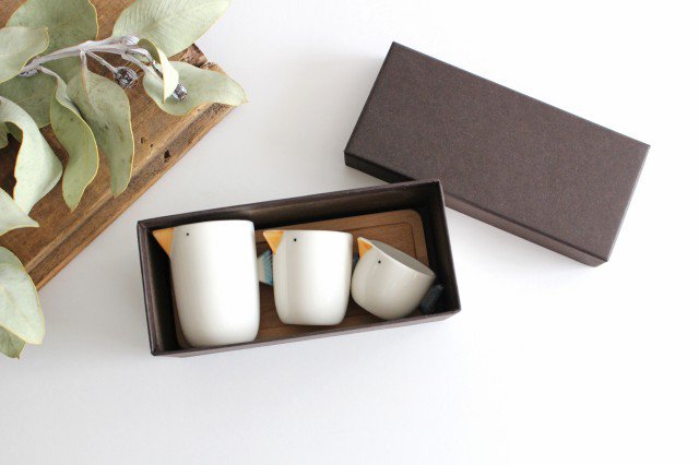 This is a set of 3 mini pots and a tray that will make you say "so cute!" due to their adorable appearance. The spout is a beak. The handle is a tail. Draw round eyes...and you'll have three large, medium and small siblings who are close friends. It comes with a natural wooden tray, and it will make you feel warm even when it's on standby.