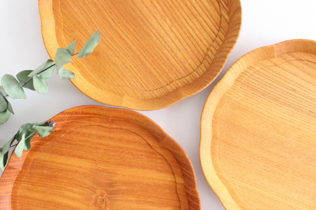 This tray has a cute wreath shape expressed in gentle curves. When you touch it, you can feel the warmth of the wood from your palm. People tend to think that solid wood items are difficult to maintain, but that's actually not the case. If it's just crumbs from bread or sweets, just brush it off, but if you're concerned about dirt, just wipe it with a tightly wrung out cloth or rinse it off with water. If it starts to feel dry, you can treat it with oil to give it a nice shine and bring out the wood grain. The more you use it carefully, the more its flavor will change over time. I would be happy if you could feel the joy of growing your own.