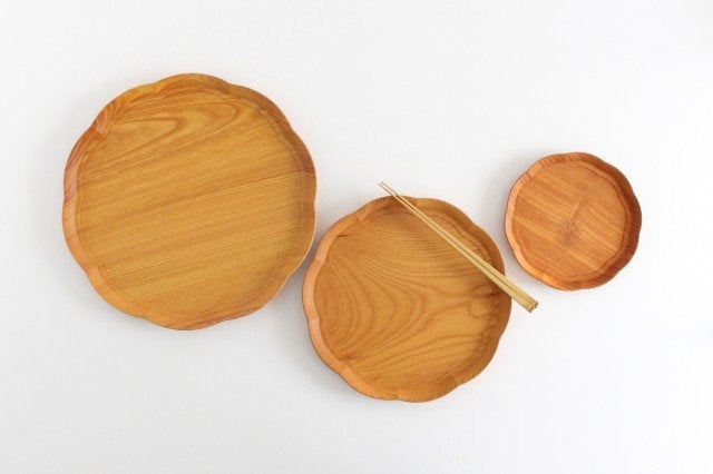 This tray has a cute wreath shape expressed in gentle curves. When you touch it, you can feel the warmth of the wood from your palm. People tend to think that solid wood items are difficult to maintain, but that's actually not the case. If it's just crumbs from bread or sweets, just brush it off, but if you're concerned about dirt, just wipe it with a tightly wrung out cloth or rinse it off with water. If it starts to feel dry, you can treat it with oil to give it a nice shine and bring out the wood grain. The more you use it carefully, the more its flavor will change over time. I would be happy if you could feel the joy of growing your own.