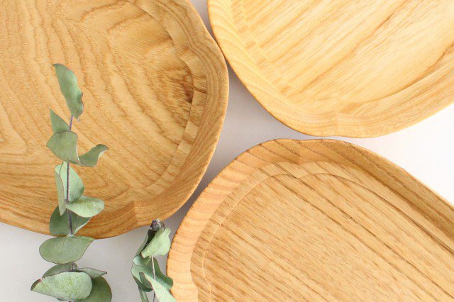 This is a tray that looks like a horizontally stretched melon shape. The material, chestnut wood, has a calm color that is said to be "grayish white." The surface is slightly rougher than cherry wood giving it a rustic wooden look. There are no places for fingers to get caught, and it has a smooth and comfortable texture. People tend to think that solid wood items are difficult to maintain, but that's actually not the case. If it's just crumbs from bread or sweets, just brush it off, but if you're concerned about dirt, just wipe it with a damp cloth or rinse it off with water. If it starts to feel dry, you can treat it with oil to restore its shine and bring out the wood grain.