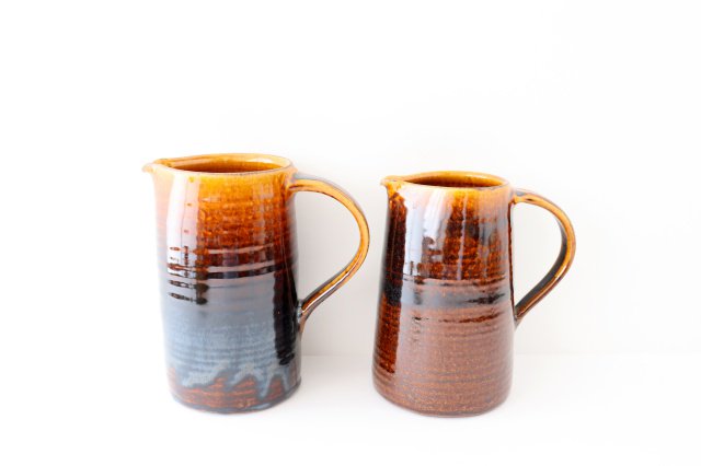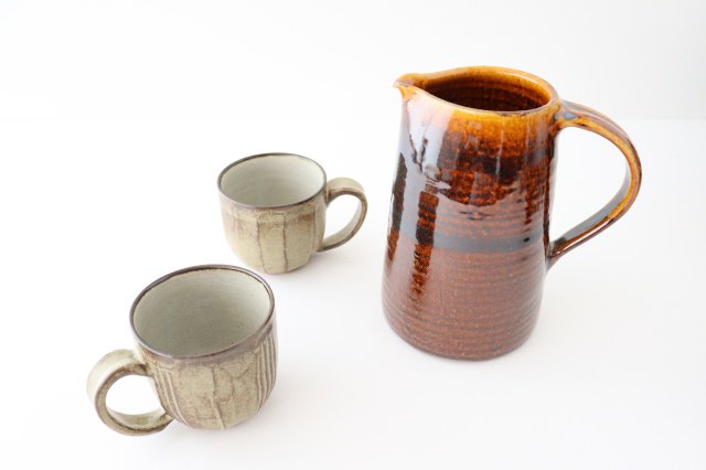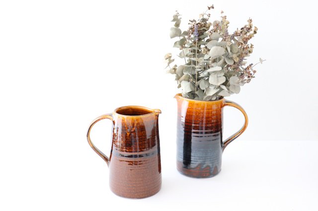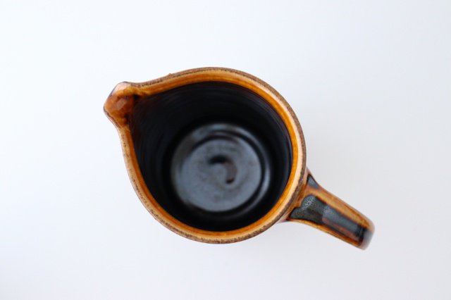 A beautiful pitcher with a glossy amber color. The rich and flavorful color and heavy weight give it an outstanding presence. Brown glaze is a glaze that tends to show differences in color shading, so there are individual differences in color, ranging from light brown to almost black. We hope that you will enjoy the tasteful texture of these products, which are unique to handmade products and cannot be found in mass-produced products.