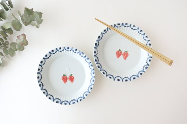 A plate decorated with strawberries and a pattern decorating the rim. The transparent white porcelain has a slightly bluish tinge, and the blue pattern on the edges stands out, creating an elegant atmosphere. In the center of the plate, there are two red strawberries. The three-dimensional texture of strawberry seeds and stems is expressed by the “itchin” technique, in which mud is squeezed out in thin strips, and the texture can also be enjoyed.The cute designs will bring a sense of comfort to your dining table.