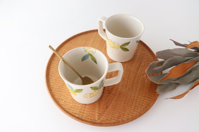 A cute mug with lemon decoration. The lemon pattern stands out against the beige base, and just looking at it will cheer you up. When you peek from the top, you can see a glimpse of lemon slices, making it an accent. The unique expressions unique to pottery, such as spots that look like freckles, are also attractive. The adorable design and gentle colors will complement any drink.