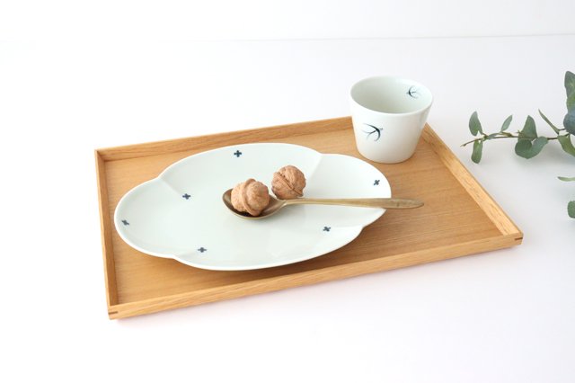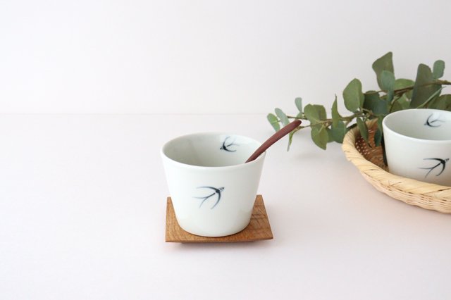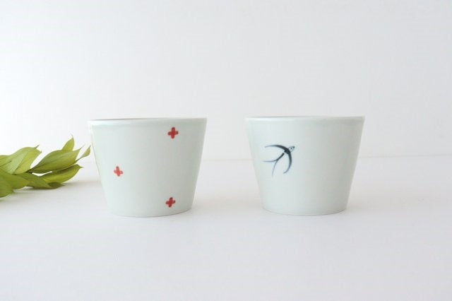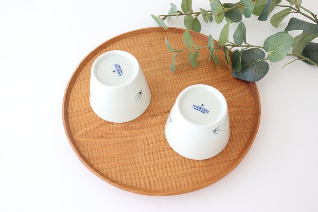 A soba choko with a peaceful appearance of swallows flying through the sky. A design that makes you feel happy, like finding a swallow in the spring sky. The transparent, slightly bluish white color and smooth texture are the unique charms of Arita ware. The rim is large, but the height is low, so you can use it on a table without feeling pressured. The simple colors go well with other pottery, making it a great addition to your everyday dining table.