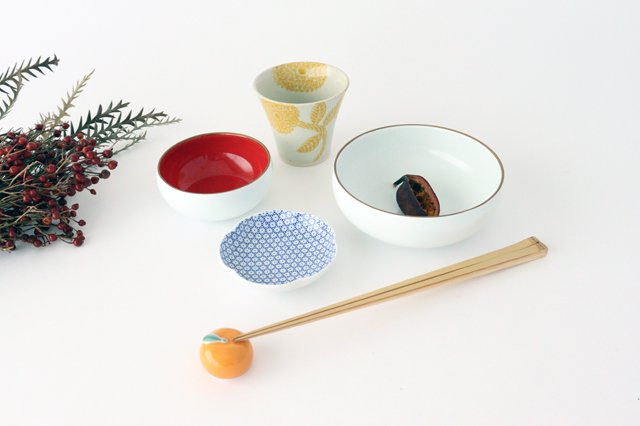 Serve spinach with sesame dressing in the medium bowl, and add chopstick rest to the small bowl. The mandarin orange chopstick rest has an adorable appearance. Another great feature is that they can be stacked for storage! New Year's decorations that suit modern lifestyles will be a great addition to your everyday dining table. It comes in an auspicious red and white box, so it's perfect for your home or as a gift for your loved ones.
