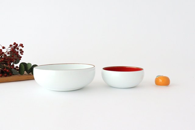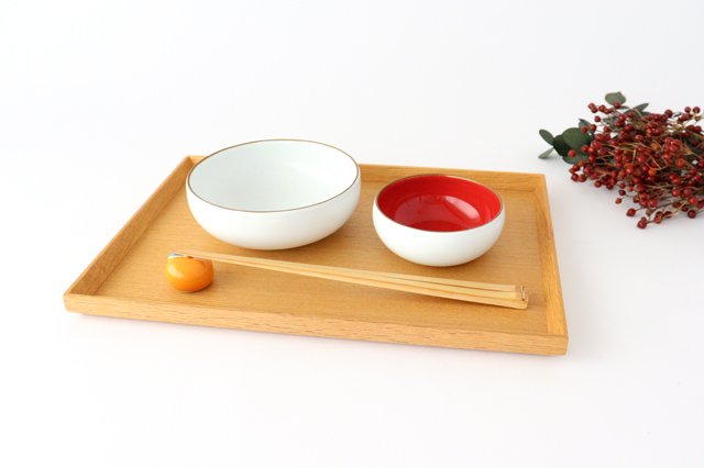 As the name suggests, this is a set of bowls that transform from kagami-mochi to tablewares. A 3-piece set that includes a medium bowl, a small bowl, and a tangerine chopstick rest. Turn the bowls upside down, stack them, and add oranges to transform them into shiny kagami mochi!  It's an auspicious design that you'll want to use from the start of the new year. The inside of the medium bowl is white and the inside of the small bowl is red, and the red and white colors create a stylish atmosphere.