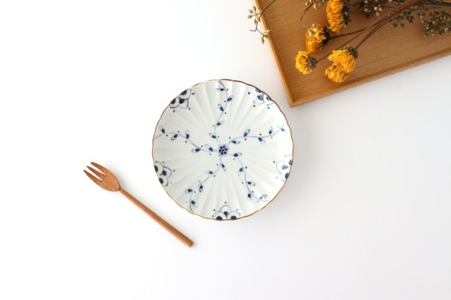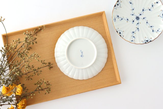 A medium plate with an arabesque pattern and a lovely flower shape. Smooth and smooth to the touch, with a natural and elegant atmosphere. The transparent white porcelain has a slight bluish tinge, and the patterns drawn with fine brushes stand out well. These plates are perfect for everyday use as well as for small celebrations.
