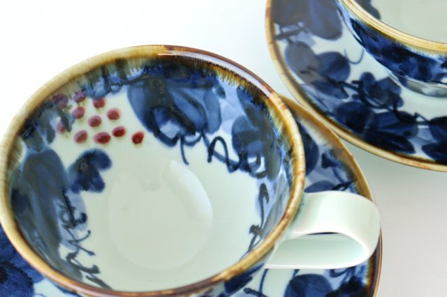 A coffee cup with a saucer that is eye-catching with bright painting. Surrounded by indigo leaves and vines, one or two grapes can be seen. It has a somewhat nostalgic atmosphere, and looks like something out of a pure coffee shop. Each piece is unique and has a unique, hand-crafted feel to it. It will make your regular tea time extra elegant.
