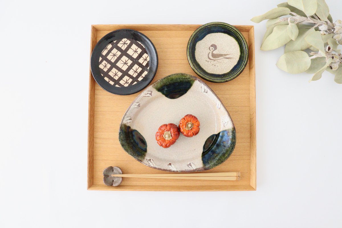 It's perfect to top with a snack and take a break with a cup of tea. It also goes well with a little Daifuku or Karinto. Add baked sweets such as cookies or madeleines to a plate for a slightly modern and stylish dish. It is useful not only as a snack, but also as a small side dish, such as green beans with sesame dressing or pickles. They can also be stacked, so it's a good idea to keep multiple copies for your family or guests.