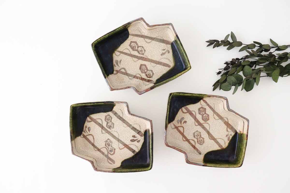 The tip has a tortoiseshell pattern and the body has lines, making it a design that enhances your food no matter what angle you look at it. The three small legs make this dish look a little special. The moss-like deep green of the Oribe glaze is beautiful, and the incisions that spread throughout the plate add depth of flavor. It has a somewhat nostalgic atmosphere, and will create a peaceful time at your dining table.