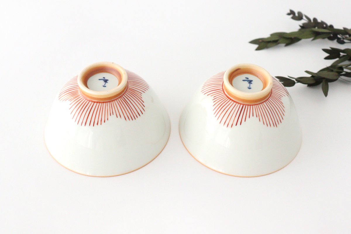 This rice bowl features plum blossoms expressed in a vertical striped pattern. If you look at it from above, you'll see a large plum blossom, and if you turn it over, you'll see a smaller plum blossom. No matter what angle you look at it, the carefully drawn patterns will delight you. The height of the base and the slightly curved edges are exquisite, and the form fits easily in your hand. The skills of Arita's craftsmen, who have continued to create pottery with consideration for the people who use it, shine through.