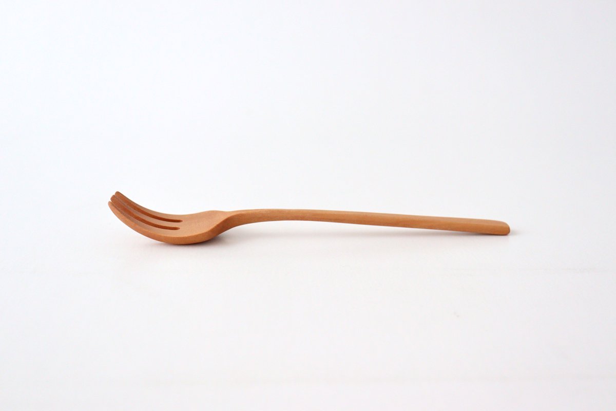 A table fork made from a fruit tree called Sao in Indonesia. The wood with its beautiful grain is made of hard wood, but because it is coated with urethane, it feels smooth and comfortable. It is carefully made, has a very pleasant texture, and will be fun to use every day. It has excellent durability and water resistance, making it perfect for everyday use.