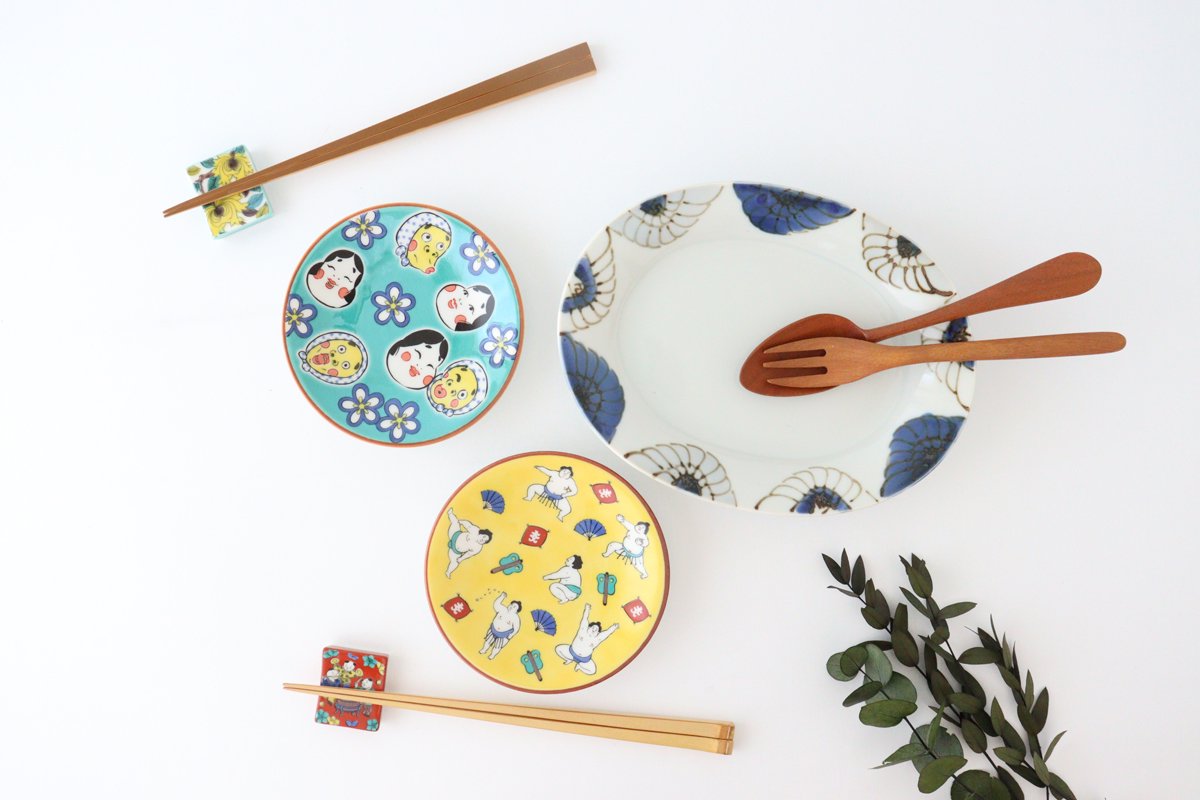 A small plate with a humorous pattern that catches the eye. There are rows of sumo wrestlers stomping their feet and throwing salt. “Hakkeyoi, Nokotta!” I can’t help but want to shout.  When you touch it, the plump unevenness of the pattern feels comfortable to the touch. The bright colors and patterns will instantly brighten your mood.