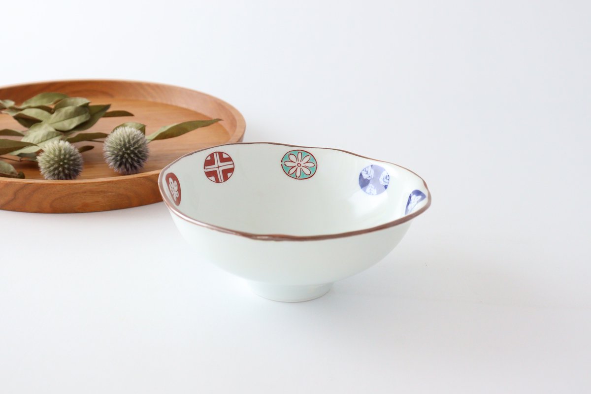 This bowl has gorgeous red paintings and dyed patterns all around the rim. Transparent, slightly bluish white color, smooth to the touch. The round crests, which have a wonderful Japanese modern feel, are each individually drawn using a stamp. It looks like it will add a touch of beauty to not only everyday life, but also small celebrations.