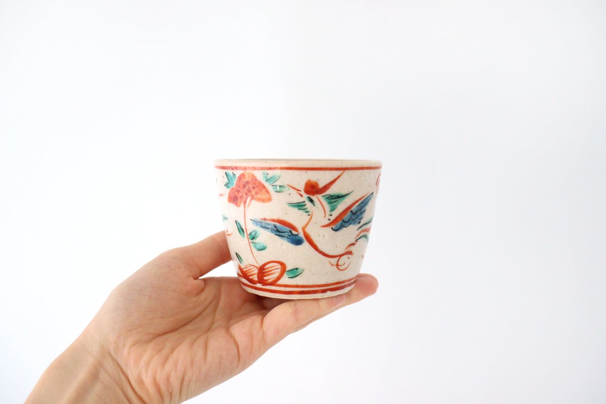 This is a soba choko with a phoenix drawn on it. Colors such as green and black are applied to parts of the surface, mainly in red, creating a gorgeous atmosphere. You can feel the craftsmanship in the delicate yet powerful brush strokes.  The red paint is a special red that takes 1,000 days to create by grinding the red pattern that is the raw material. As you use it, the color will develop into a deeper color, so you can enjoy the changes as well.