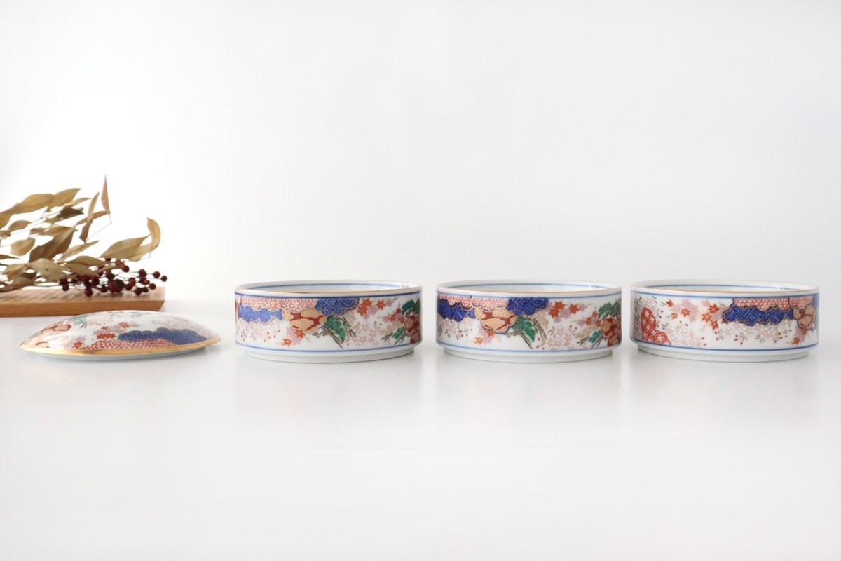 A three-tiered dish that brightens up your dining table. Spring and autumn patterns are beautiful patterns unique to Japanese people who appreciate the four seasons. On white porcelain, cherry blossoms in spring and autumn leaves are expressed in a poetic manner. The lid is also carefully painted, making it a masterpiece that gives you a sense of the elaborate attention to detail.