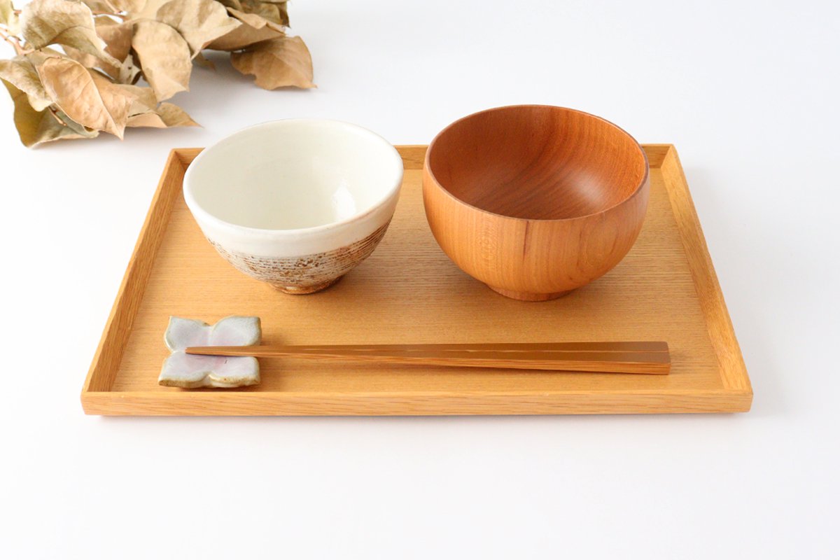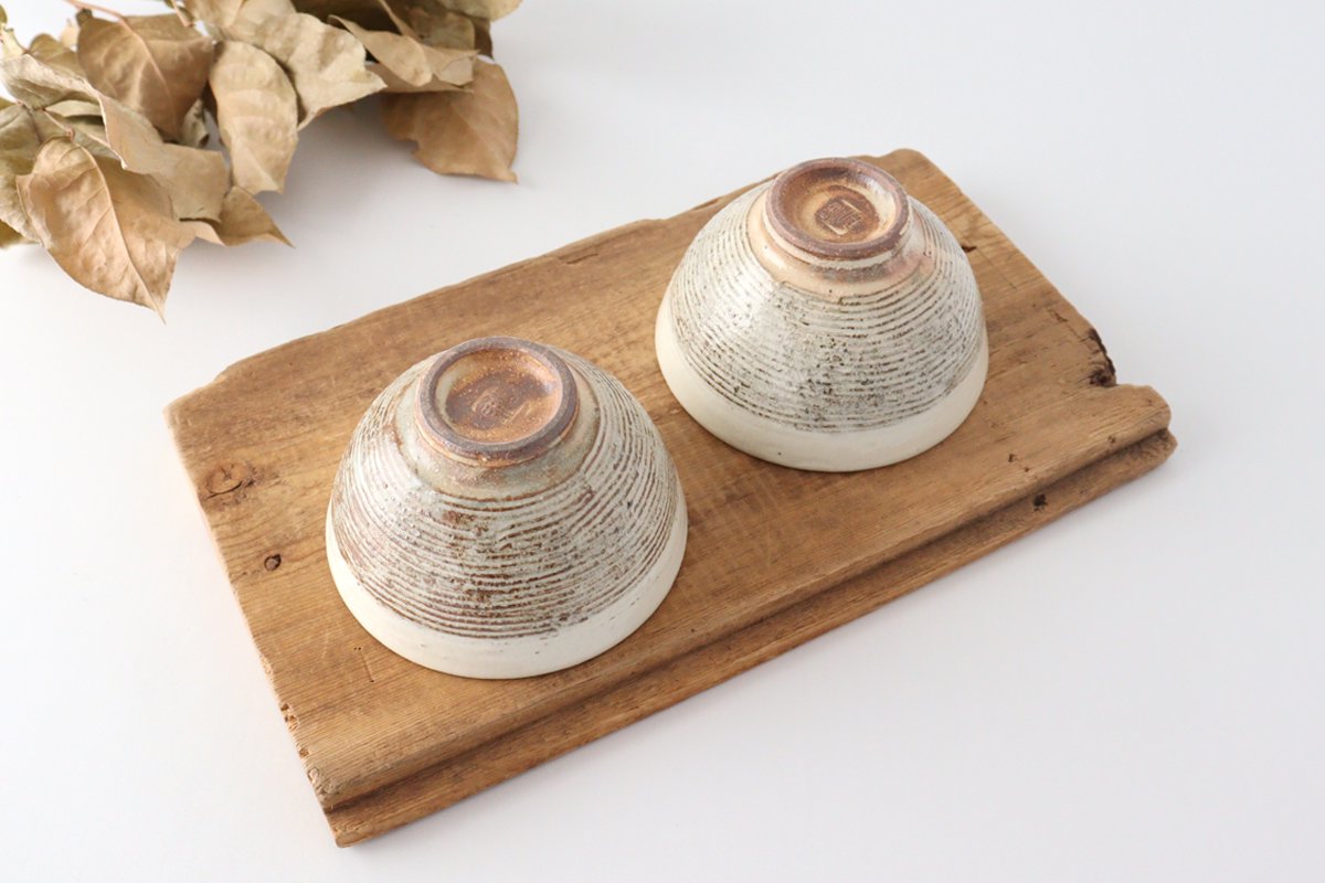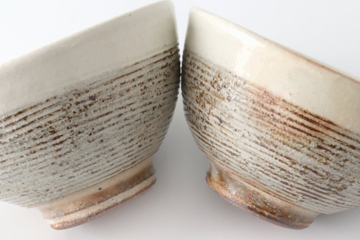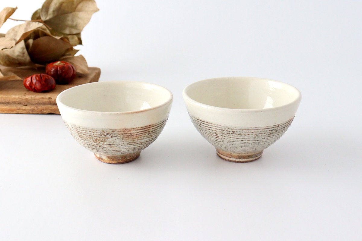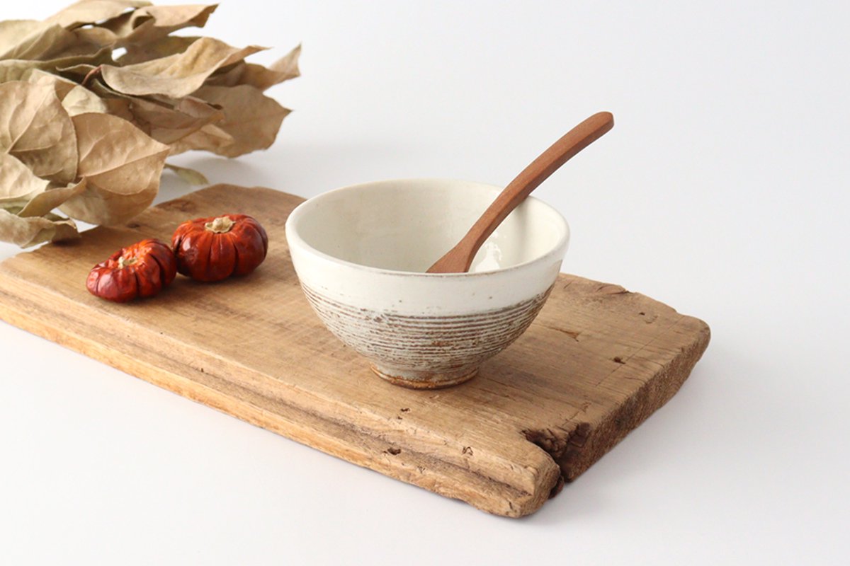 This rice bowl has a lovely soft color and texture. The outside is painted with rough clay and carved with a comb. The carved parts have a slightly rough texture that is unique to clay. It has a simple and gentle texture, so it's easy to match it with other pottery.