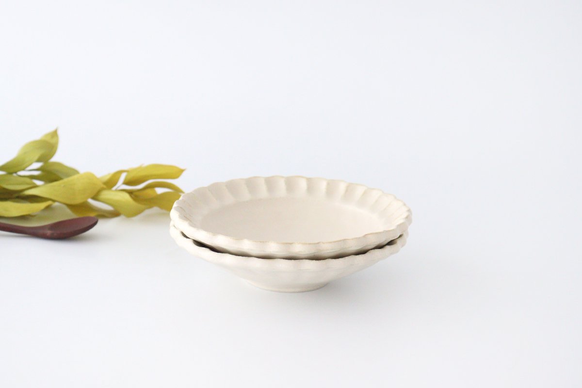 A bowl with an antique feel. The soft white color gives it a natural look. The thick edges make it difficult to chip, making it easy to use on a daily basis. The small, cute petals line up and add an elegant touch to your dining table.