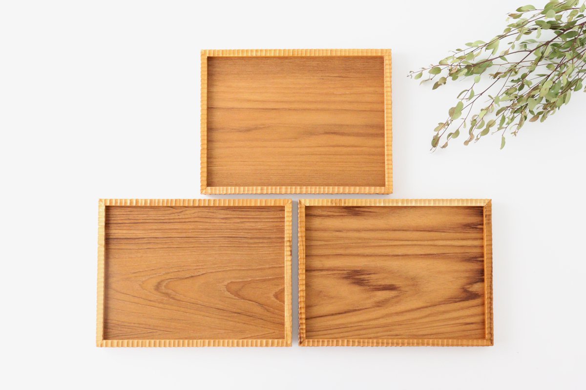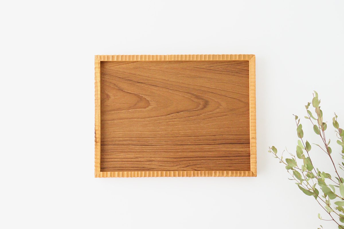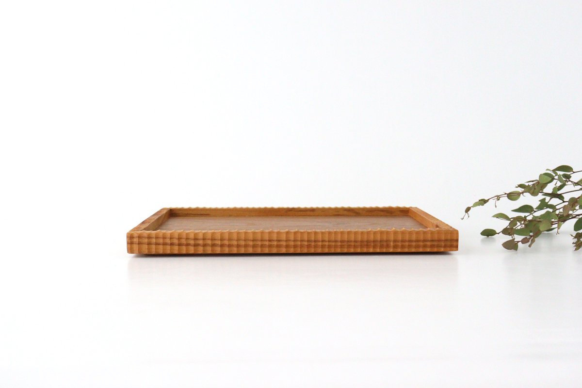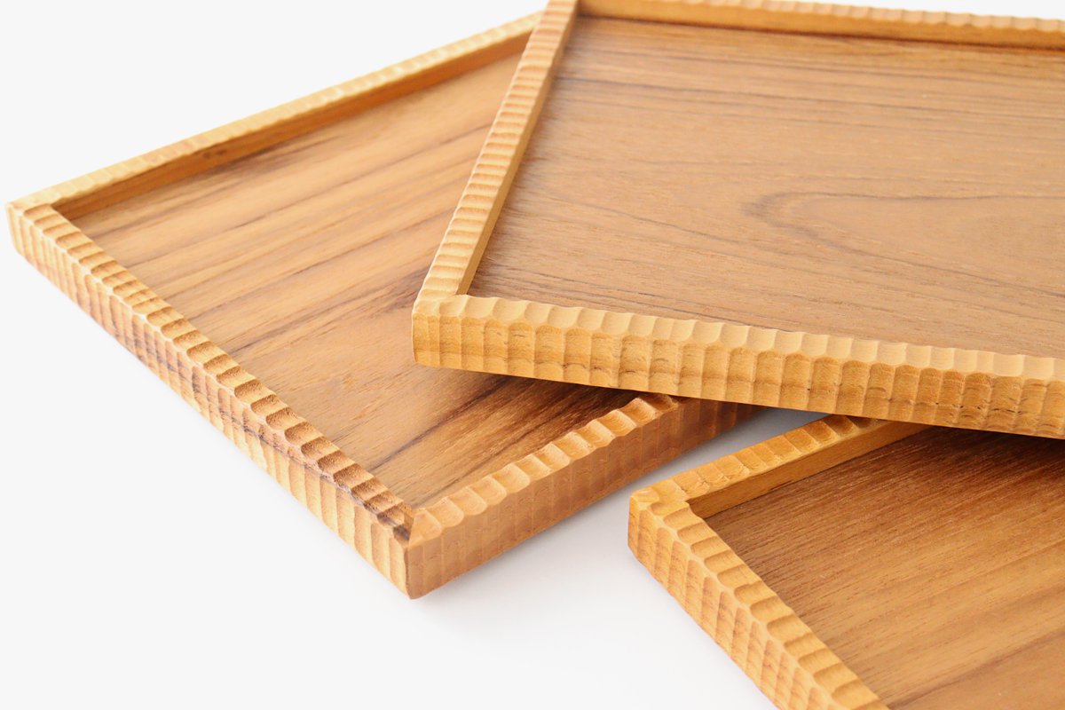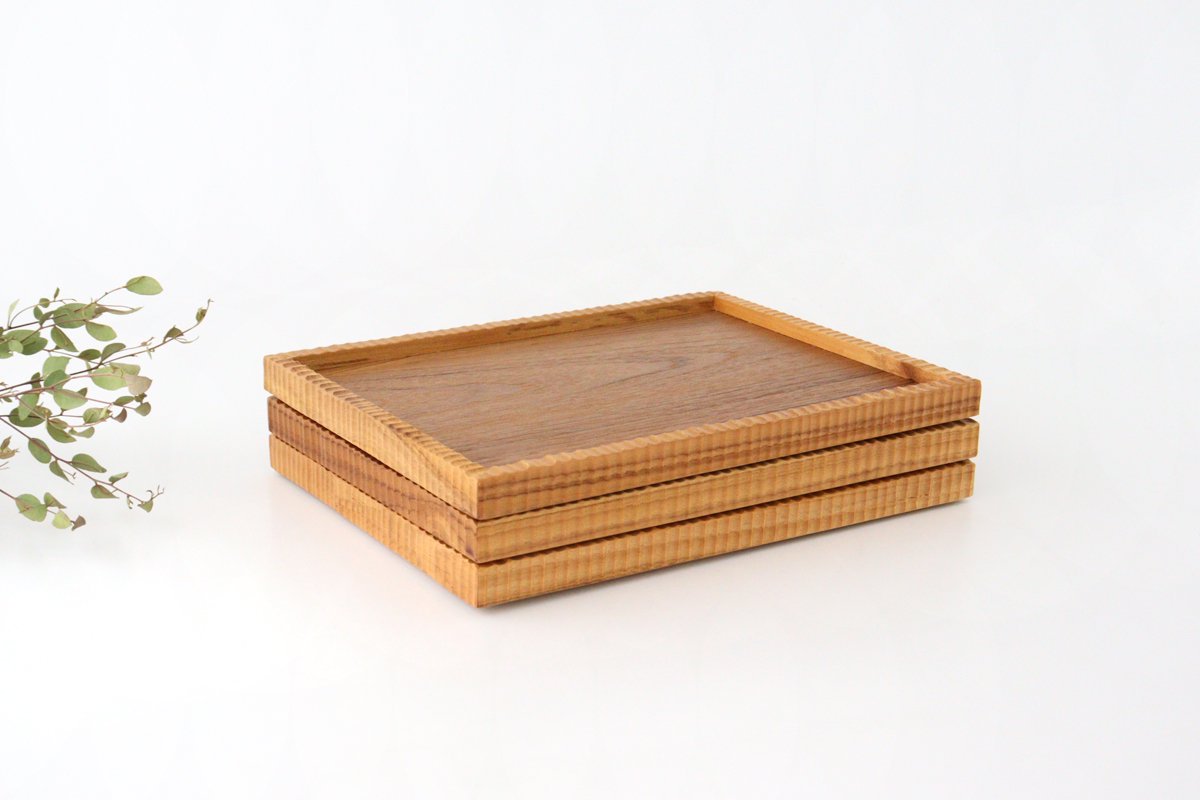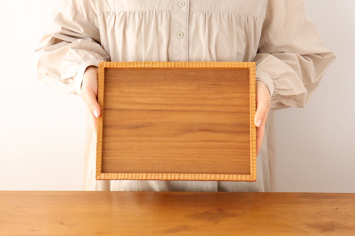 A stackable tray with carved edges. A warm texture that gives you the feeling of hand-carving. The back side is designed so that the trays can be stacked on top of each other.Another nice feature is that the edges are raised, making it easy for your fingers to rest on them. It has excellent durability and water resistance, making it perfect for everyday use. Thinking about how to use it each day will be enjoyable.