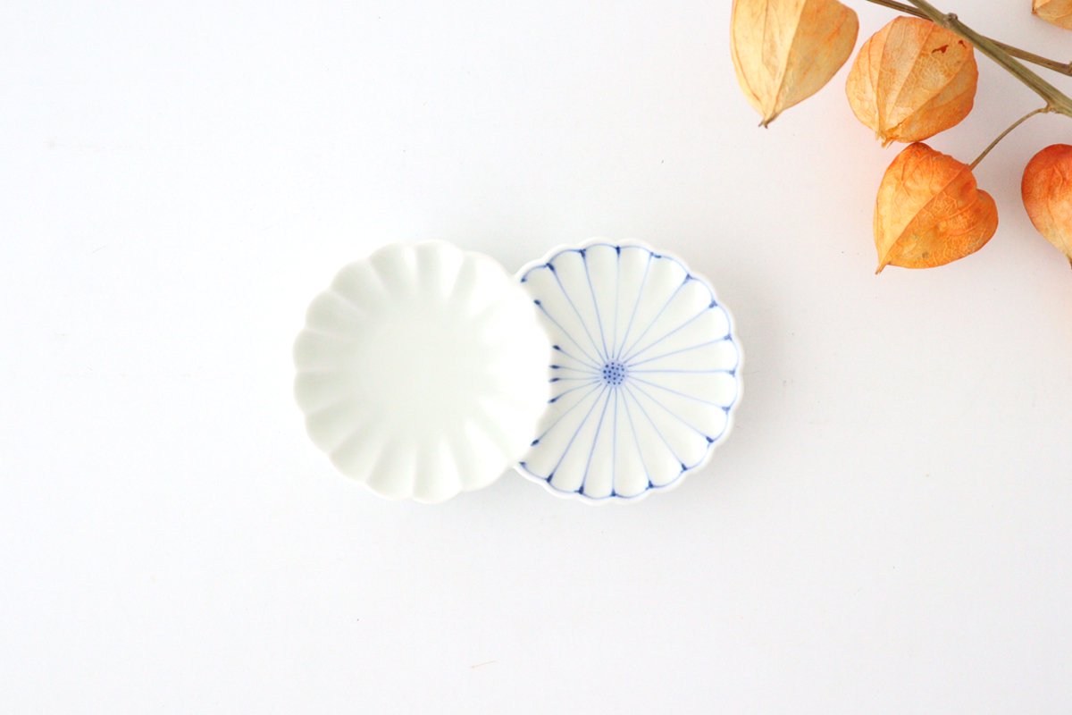 This plate has a design that looks like a series of small plates. The glossy texture and chrysanthemum form create an elegant atmosphere. The chrysanthemum pattern drawn with a fine brush stands out well on the transparent, slightly bluishーwhite porcelain. It's sure to add a touch of beauty to everyday life, as well as to small celebrations.