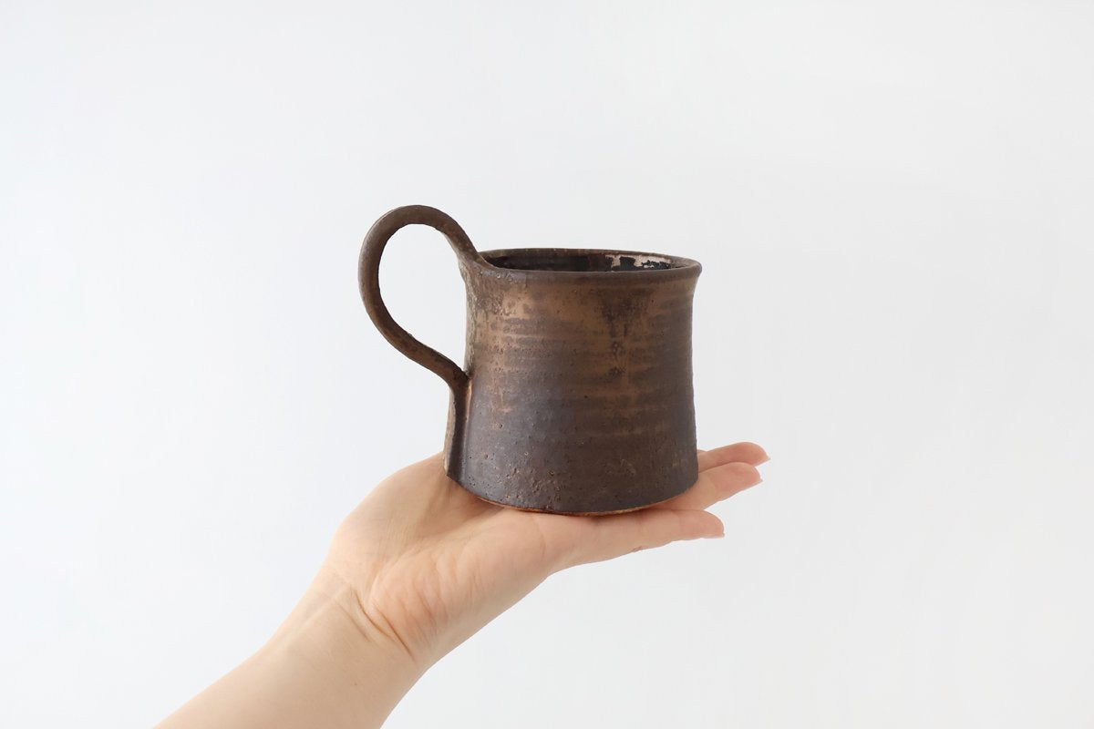 This is a mug that looks like an antique. The bronze color that changes depending on the viewing angle is attractive. When you pick it up, the outside has a rough texture and you can feel the warmth of the earth. The glaze that slowly oozes out on the inside gives it a tasteful appearance. With a mature look, it will make your everyday dining table look much more elegant.