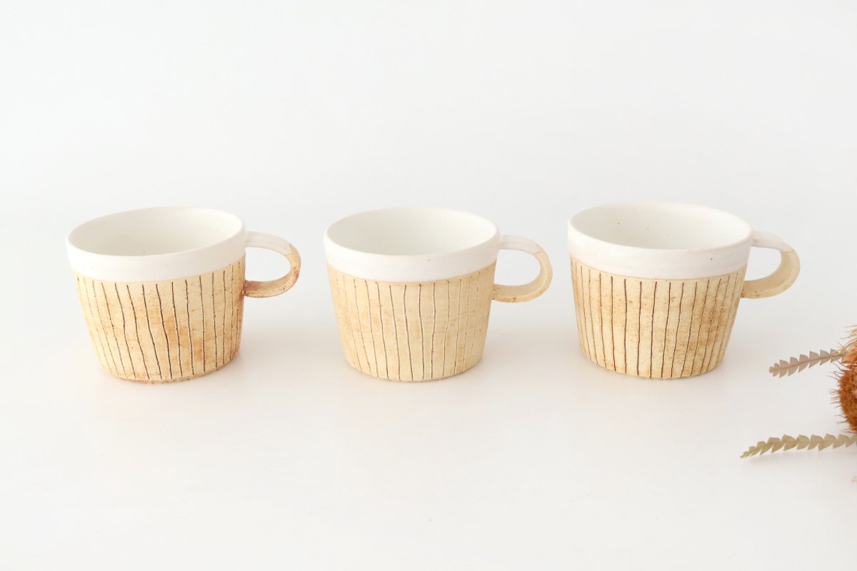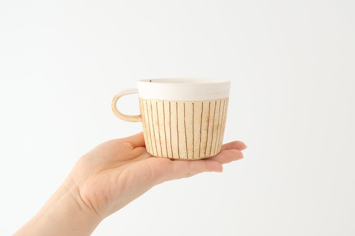 A mug that will fit in with your everyday dining table. The loose vertical lines create a warm feeling. The color, which looks like a mixture of orange and brown, gives it a tasteful look. The outside has a rough texture, while the inside has a smooth texture. Please enjoy the distinct textures of each.