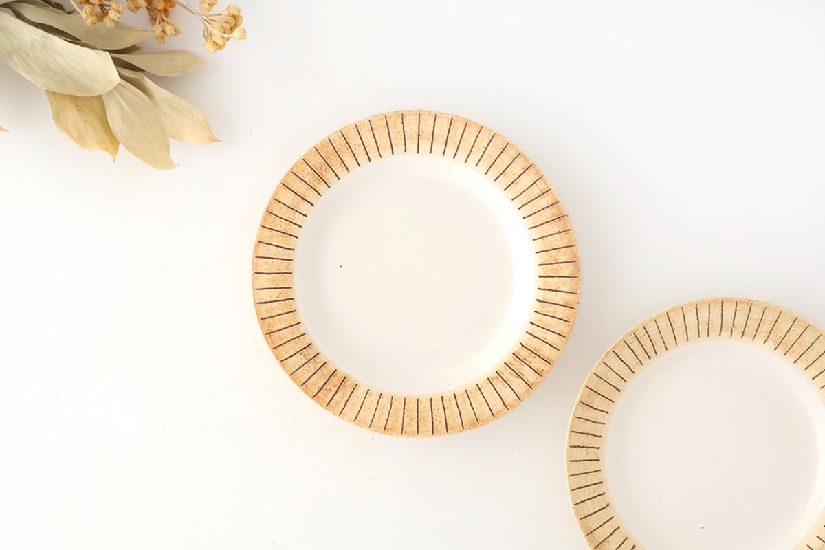 A plate that fits well with your everyday dining table. The loose vertical lines on the rim give it a warm feel. The color, which looks like a mixture of orange and brown, gives it a tasteful look. The rim has a rough texture, while the inside has a smooth surface. Please enjoy the different textures of each.
