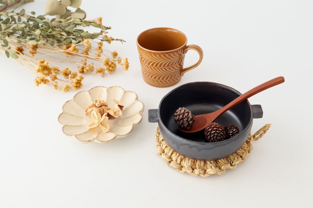 This is a heat-resistant pot that can be used over direct heat. The slightly brownish black color creates a calming atmosphere. The uneven, curved form is also a unique charm of handmade products. The dripping of the glaze also gives it a tasteful look. The small attached handle is a cute accent.