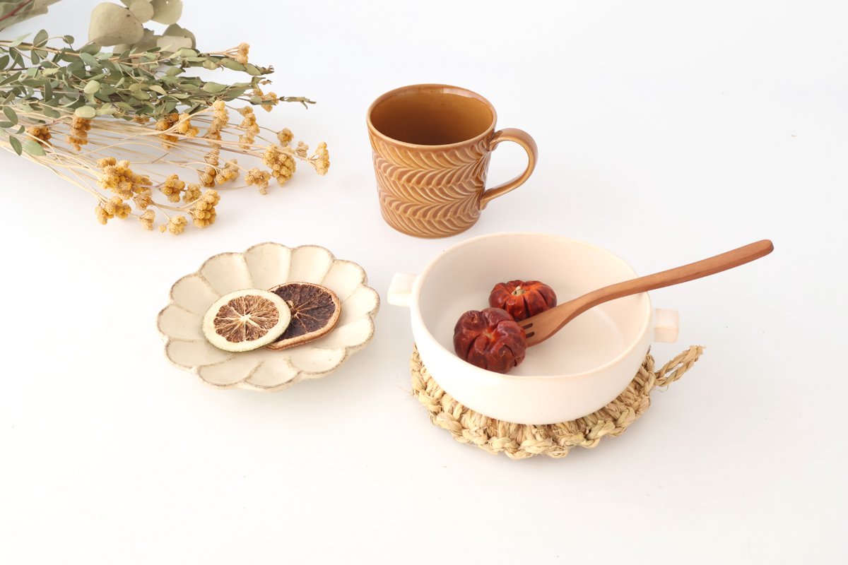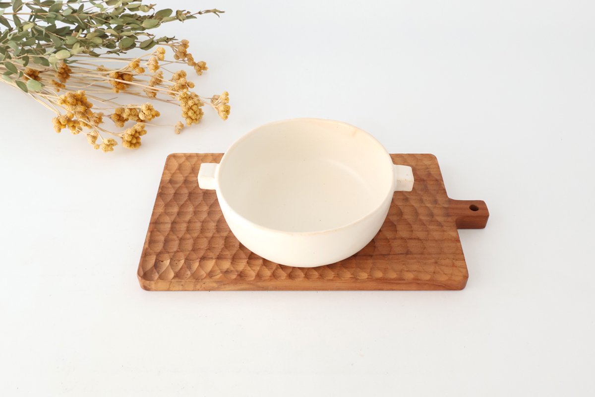 This is a heat-resistant dish that can be used over direct heat. The soft white with a slight reddish tinge creates a calm atmosphere. The uneven, curved form is also a unique charm of handmade products. The freckled iron powder that appears here and there is charming. It has a gentle texture that complements any dish.