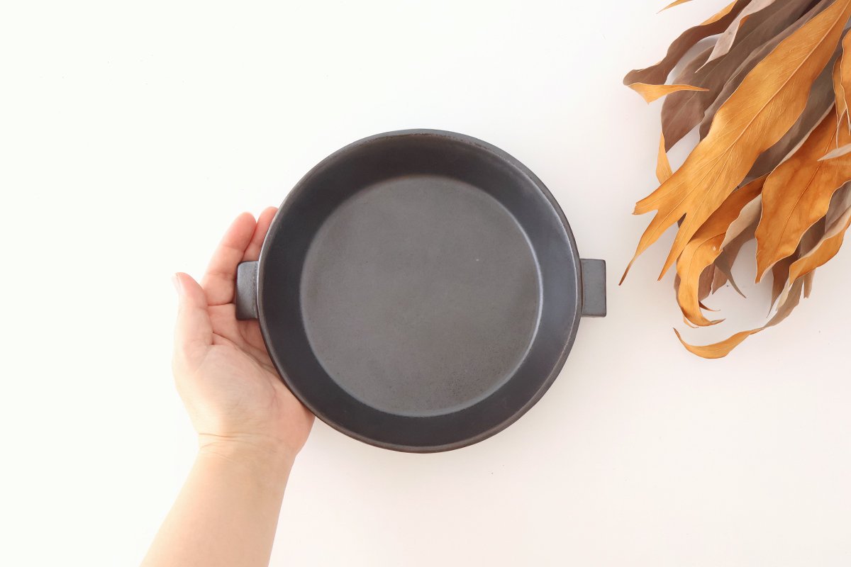 A heat-resistant ceramic plate that can be used over direct heat.  The slightly brownish black color creates a calming atmosphere. The uneven, curved form is also a unique charm of handmade products. The dripping of the glaze also gives it a tasteful look. The small attached handle is a cute accent.