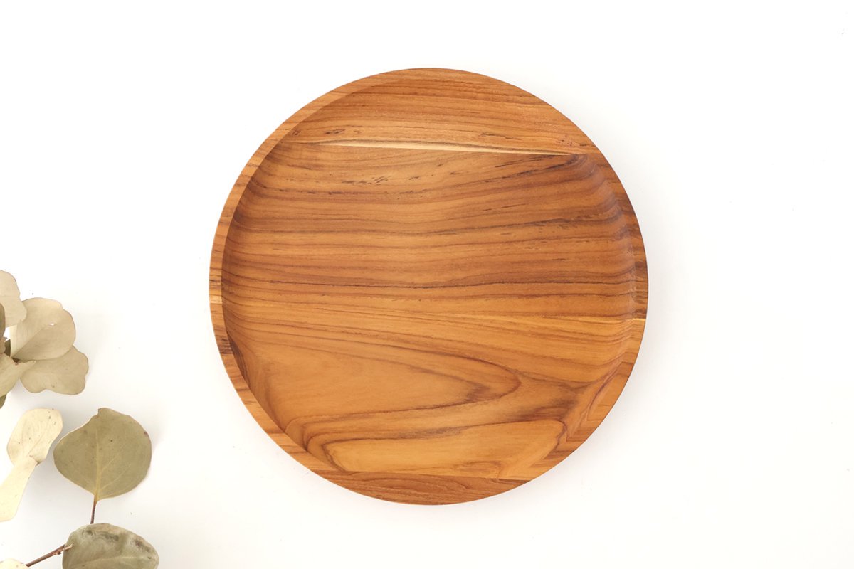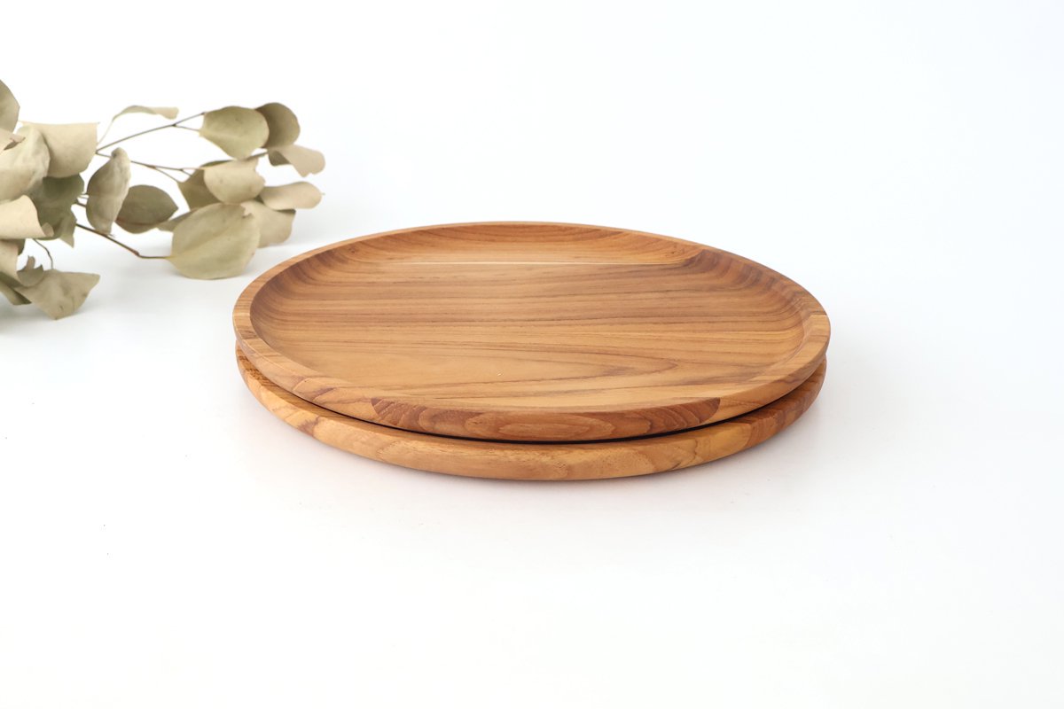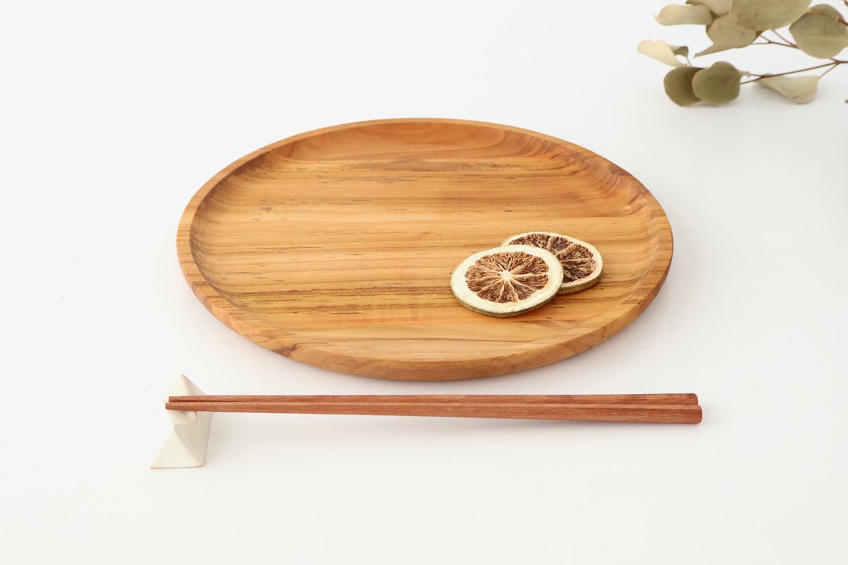 A bread plate with an appealing soft appearance made from teak wood. The slightly rough wood texture and simple, sophisticated form are attractive. The way the knots and wood grain appear varies and wood grain appear is different, making each piece unique. It has excellent durability and water resistance, making it perfect for everyday use. Thinking about how to use it each day will be enjoyable