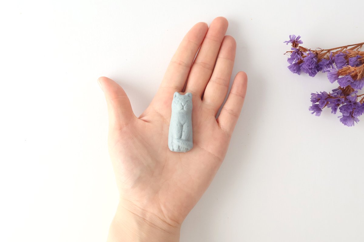 A cute cat-shaped chopstick rest. Its adorable, round form will make you say, It's so cute!'When you touch it, it has a matte surface and a slightly rough texture. The great thing about its gentle blue color is that it pairs easily with any type of pottery.Although small, it has a noticeable presence and will brighten up your dining table.