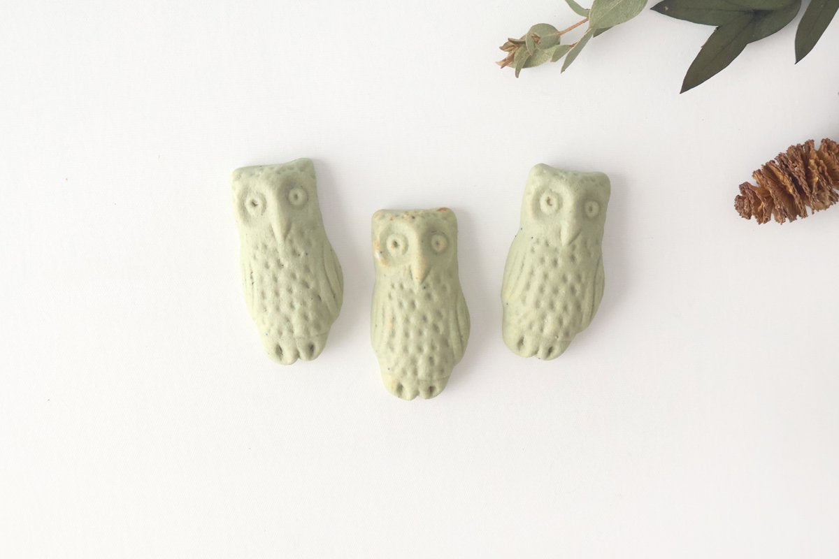 This is an owl-shaped chopstick rest that stands quietly. Its adorable, round form will make you say, 'It's so cute!I' When you touch it, it has a matte surface and a slightly rough texture. The great thing about its gentle shade of green is that it pairs well with any type of pottery.Although small, it has a noticeable presence and will brighten up your dining table.When not in use, it also makes a lovely decorative piece for your home.