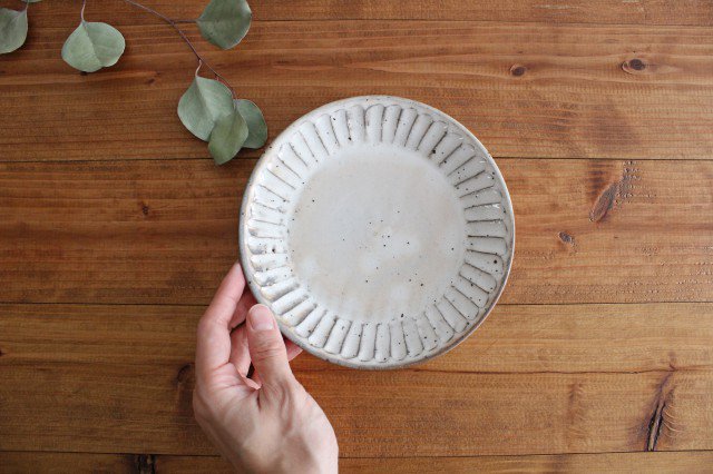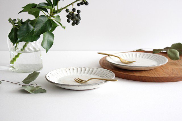 This is a plate with a pattern created by carving each one with a plane. The border that resembles flower petals gives it a lovely impression. The skin has a glossy texture and is smooth and comfortable to the touch. Depending on how well the glaze is applied, a rough texture appears in some places, giving you a sense of warmth that is unique to pottery. The slightly reddish areas and the iron points that appear here and there give it a rich look.