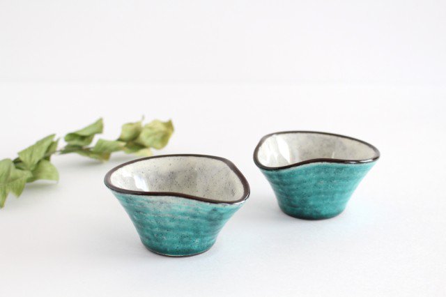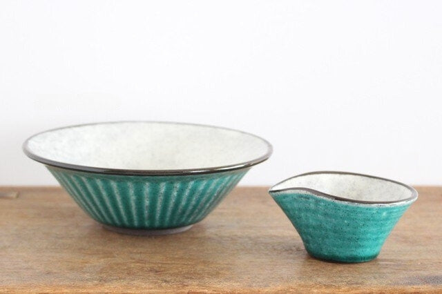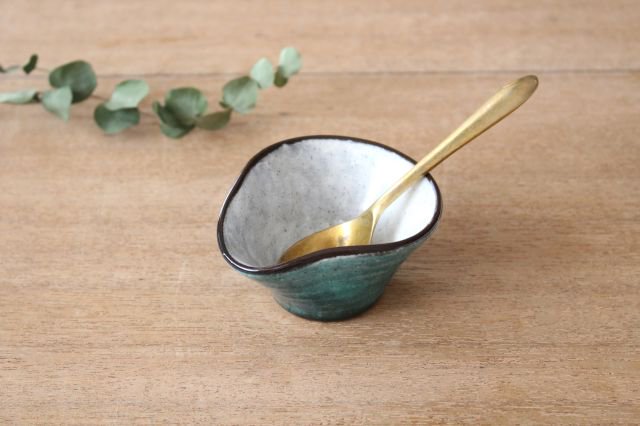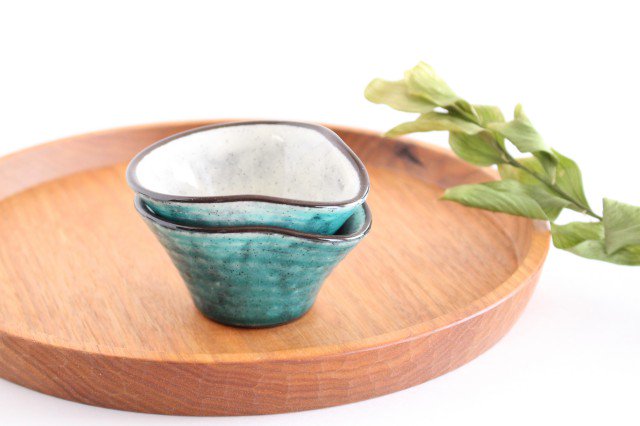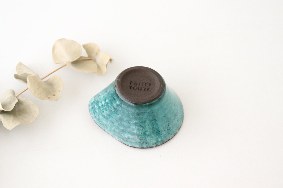 A lovely dressing cup with a bright turquoise color that immediately catches your eye. It will brighten up your dining table in a refreshing and gorgeous way. The carving lines on the outside and the crack pattern called kanyu create an even more tasteful texture. There are slight individual differences in the color of the inside, including some with a gray tinge. The natural texture goes well with natural wood cutlery.